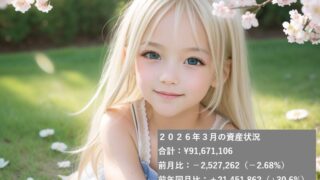 資産推移みりおん合計:¥91,671,106前月比:−2,527,262(−2.68%)前年同月比:+21,451,862(+30.6%)あるじ思ったより減ってないのぉ資産割合みりおん現金:4.7%日本株:45.7%米国株:20.2%不動産...
